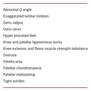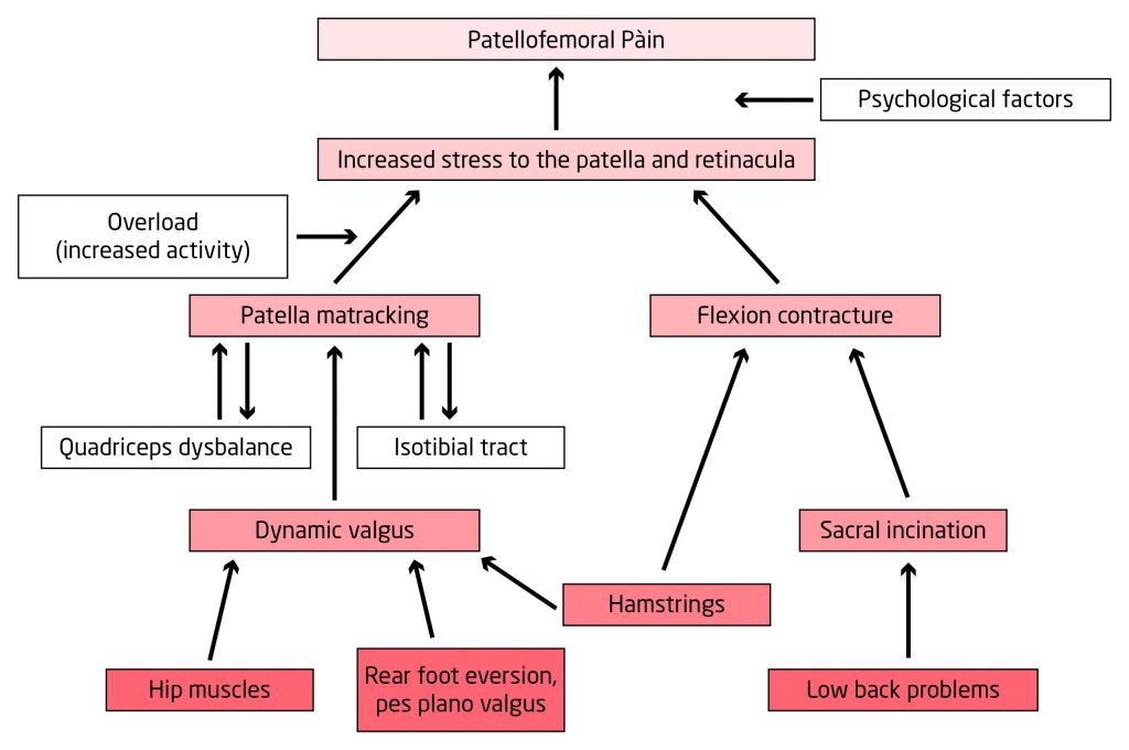 El mal recorrido de la rótula, debido a una alineación funcional errónea, podría ser una causa subyacente de SFP. Posibles causas de valgo dinámico podrían ser la menor fuerza en la musculatura de la cadera o las anormalidades del pie. También, consecuencias secundarias incluyen el desequilibrio del cuádriceps, la rigidez de los isquiotibiales o la rigidez de la banda iliotibial (W. Petersen, 2017).