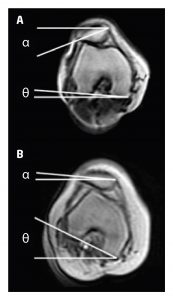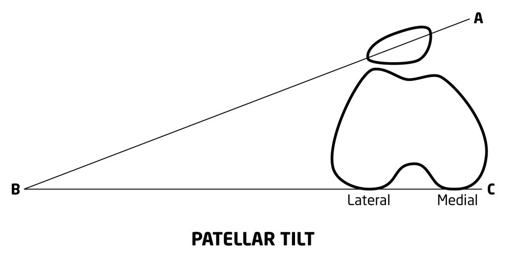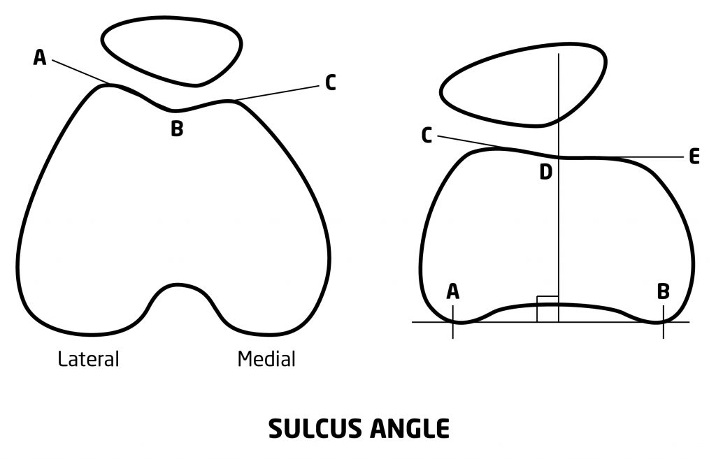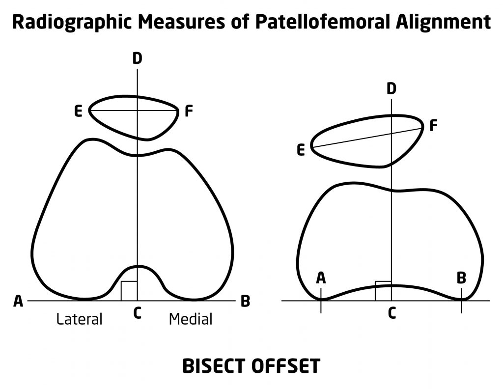 Para obtener datos cuando la tróclea es menos profunda, la línea perpendicular se proyecta hacia anterior, desde la bisección de la línea codillea posterior. La bisectriz de la rótula representa la cantidad de rótula que yace lateral a la línea media, y se expresa como porcentaje del ancho de la rótula.