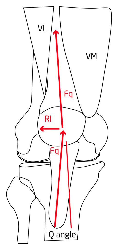 Como el ángulo Q refleja las fuerzas que actúan sobre el plano frontal de la rótula, se supone que el movimiento de la extremidad inferior en el plano frontal afectará adversamente la articulación femororrotuliana. En particular, la aducción de cadera y/o abducción de la tibia, aumentaría el ángulo Q, dado que la rótula se desplazaría medialmente con respecto a la espina iliaca anterosuperior, resultando en un valgo de rodilla excesivo.