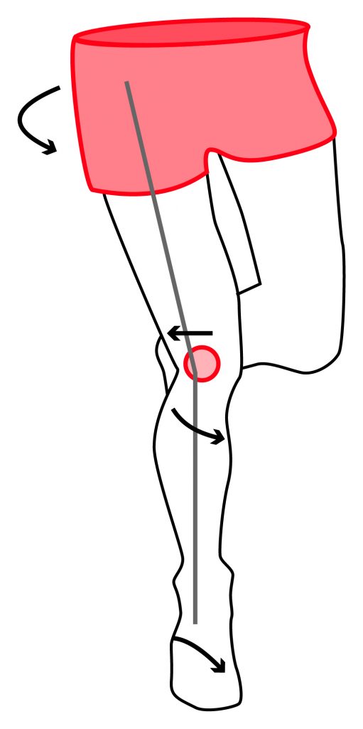 Esto llevaría al valgo dinámico de rodilla, el cual se ha demostrado que está relacionado al desplazamiento lateral de la rótula y contribuye a múltiples lesiones de rodilla, como los desórdenes de la articulación femororrotuliana.